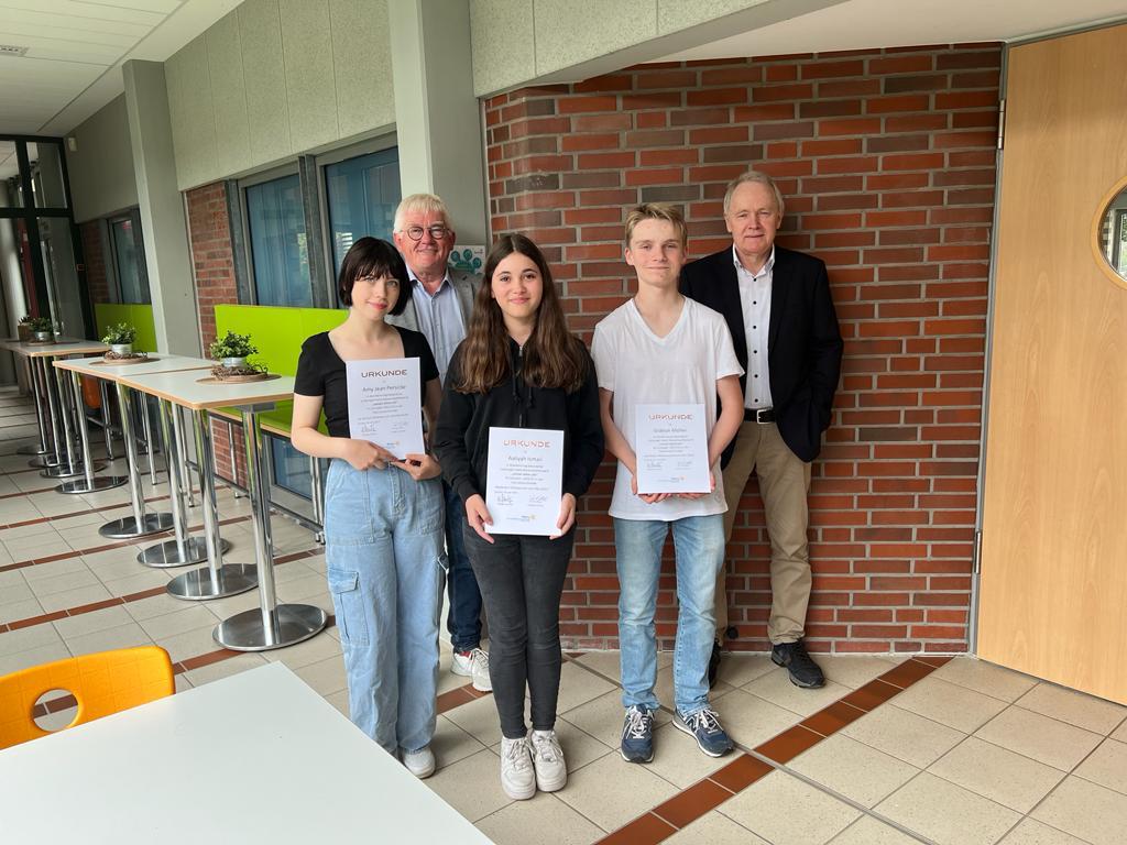 Aaliyah Ismail (Jhg 8), Gideon Möller (Jhg 9) und Amy Persicke (Jhg10) haben den Rotary Schulpreis durch den Vorsitzenden Dr. Georg Pancratz überreicht bekommen. Es ist ihnen in ihrem Jahrgang am besten gelungen, ihre Noten innerhalb eines halben Jahres zu verbessern. Der Preis umfasst neben der Hilfe bei der Praktikumssuche einen 150€ Einkaufsgutschein. Die OBS Emstek gratuliert den Gewinnern und bedankt sich bei Rotary für die Möglichkeit.