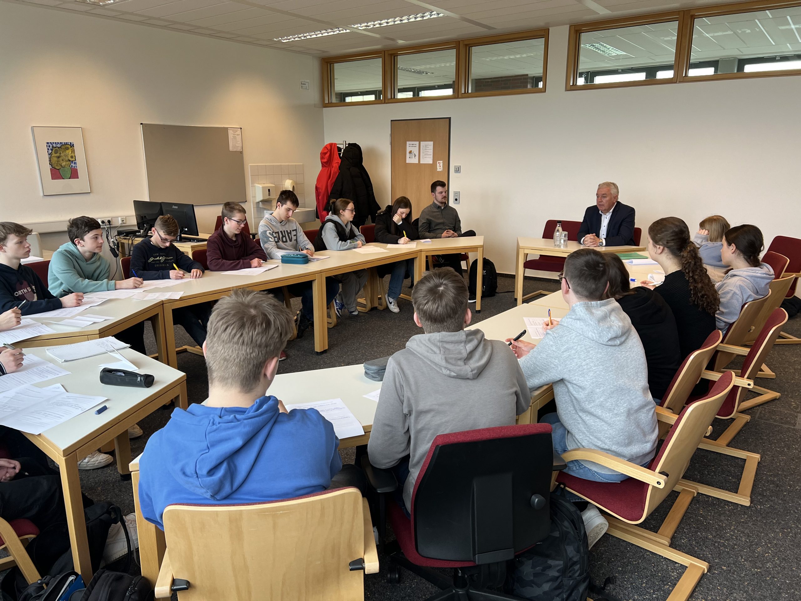 Der Landtagsabgeordnete Christoph Eilers war zu Gast an der OBS Emstek, um vor der Europawahl im Juni Werbung für das Wahlrecht zu machen, schließlich können 16-jährige an der EU-Wahl teilnehmen. Herr Eilers betonte, wie wichtig das Wahlrecht sei, um die Demokratie zu wahren und um Einfluss auf Entscheidungen zu nehmen, die uns alle betreffen.