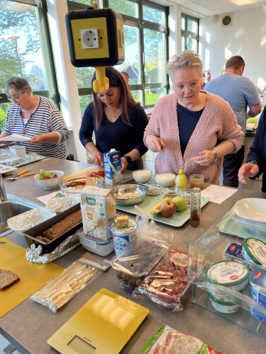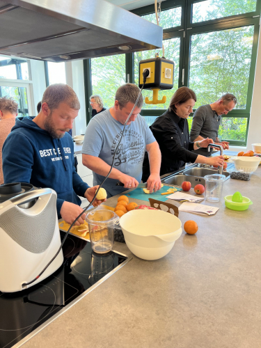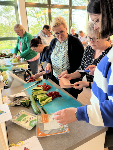 Die Kolleginnen Frau Kloster und Frau Bröring hatten mit den Mensafrauen und unserer Elternvertreterin Frau Ostermann-Lübbe einen kurzweiligen und informativen Workshop vorbereitet. Nach einem kurzen Impulsvortrag in der Mensa ging es gleich über in den praktischen Teil in der Lehrküche. In kleinen Gruppen – jeweils angeleitet von einer „Fachkraft“ – wurden verschiedene Frühstückskomponenten hergestellt, die anschließend in der Mensa verkostet und für „sehr gut“ befunden wurden.
