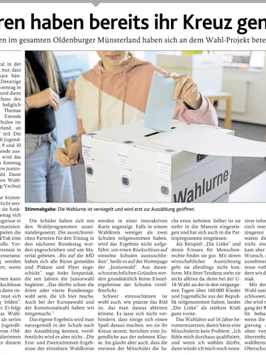Zehn Klassen der Oberschule Emstek haben am Dienstag und Mittwoch ihre Stimmen für die Bundestagswahl als Juniorwähler abgegeben. Dabei simulierten ca. 220 Schüler und Schülerinnen den Wahlakt mit den Stimmzetteln unseres Wahlkreises 32 und wurden dadurch sicherer für die zukünftigen „echten“ Wahlen als Erwachsene.