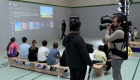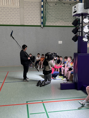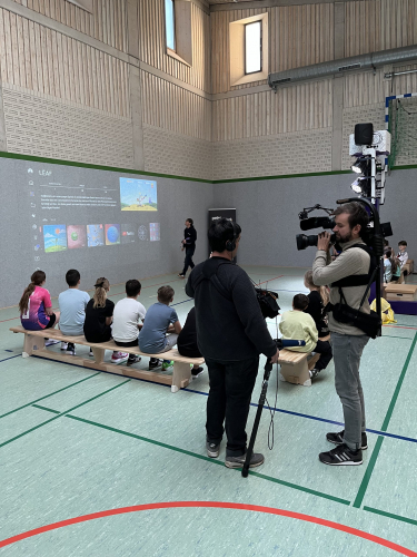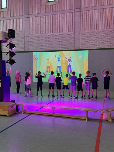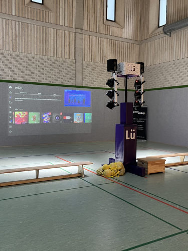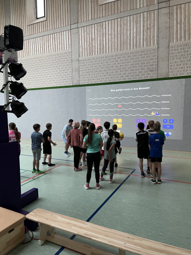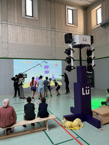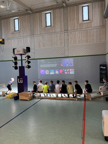 Highlight des Tages war die interaktive Sporthalle „Lü“ (siehe Bilder), in der die Schülerinnen und Schüler in Bewegung verschiedene Aufgaben lösen mussten, wie z.B. ein Quiz mit Fragen zum Thema „Umwelt“, das Pflanzen eines Baumes oder das Einreißen einer Mauer.
